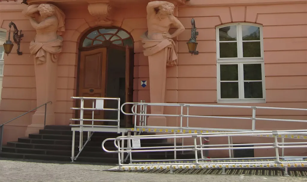 Jede Roll-A-Ramp kann auf Wunsch fest installiert werden. Dabei sind keine größeren Eingriffe in die vorhandene Bausubstanz erforderlich. Alle Installationen sind vollständig reversibel. Oft reichen 2 Befestigungspunkte in der oberen Ebene. Auch Befestigungen im Boden, die ganz auf Eingriffe am Gebäude verzichten sind möglich. Dies ist z.B. sinnvoll bei Gebäuden mit Denkmalschutz, wie hier beim Mainzer Landtag gut zu sehen ist.